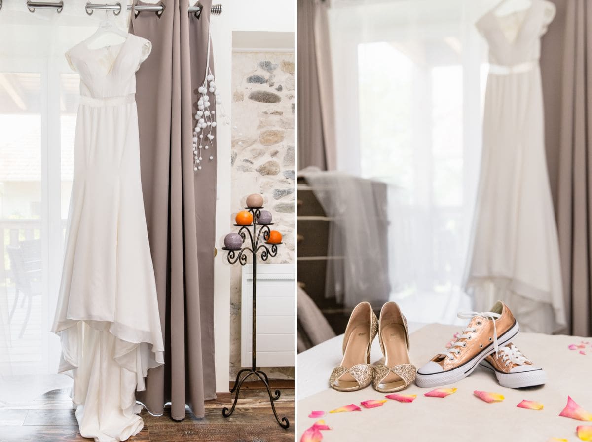 Quand j’ai rencontré M&M pour la première fois, ils mont dits qu’ils portaient des Converse tous les jours et que pour leur mariage il en serait le même. La consigne avait été donnée à tous les invités : « être classe en Converse ». En somme, le but d’un thème de mariage est de coller à l’univers du couple. Et puis, ce n’est pas désagréable d’être en confort dans ses chaussures le jour d’un mariage. Du coup, je trouvais l’idée très chouette et cela m’amusait déjà d’imaginer faire une photo de la robe de mariée avec les Converse à côté.