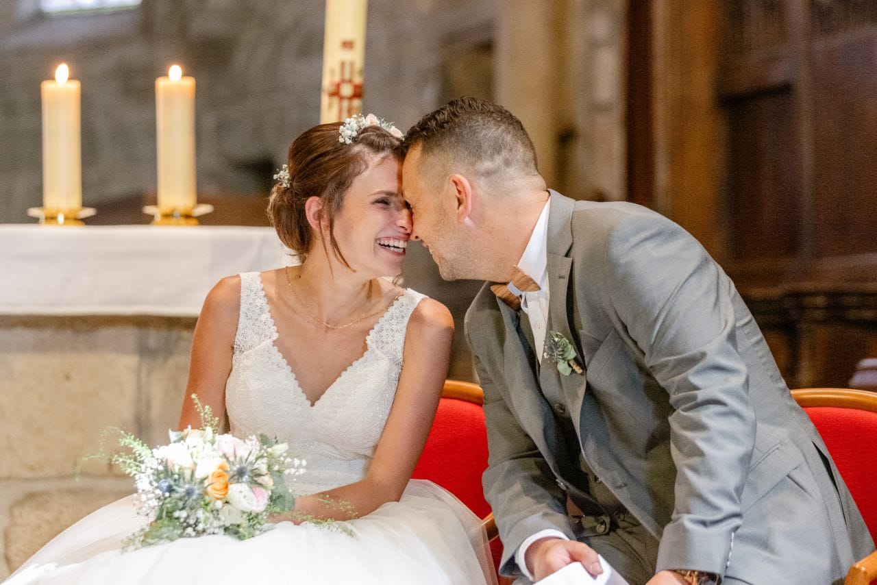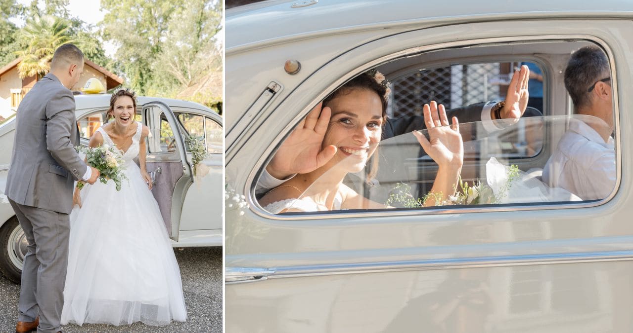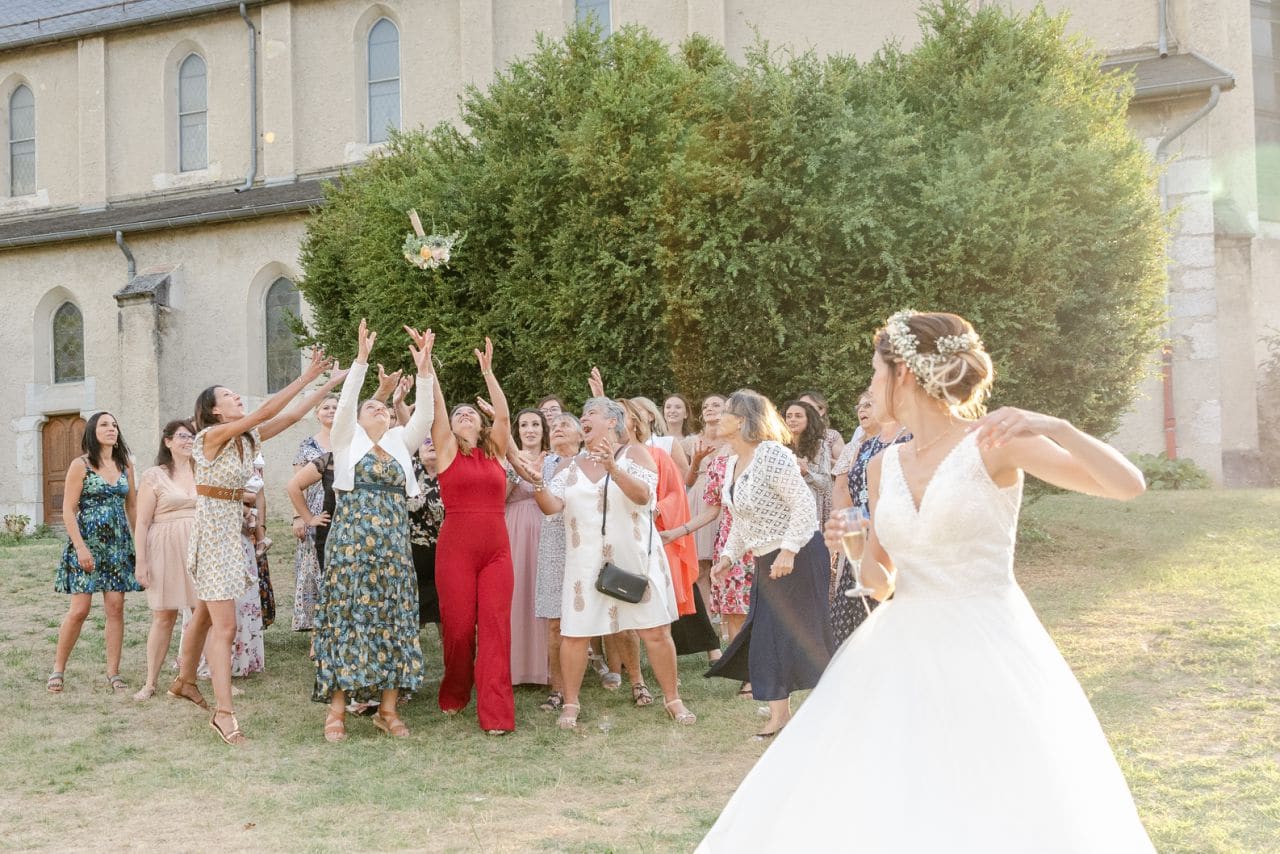 Nous avions rendez-vous sous un soleil radieux devant la mairie de Yenne. Pendant que le futur marié accueillait les invités, je tendais l’oreille à l’affût des coups de klaxon qui préviendraient de l’arrivée de la mariée. Ils souhaitaient se voir pour la première fois avant de faire leur entrée dans la mairie. Et les larmes d’émotion étaient bien là. Après l’union civile, tout le cortège s’est dirigé vers l’église juste à côté. Ce fût une très belle cérémonie religieuse, touchante et joyeuse. Ensuite, c’est accompagnés de leurs enfants qu’ils sont sortis de l’église sous une déferlante de bulles. Après les traditionnelles photos de groupe, le temps était venu de prendre les voitures pour réaliser un cortège qui ferait le tour du village de Yenne avant de monter à Saint-Paul.