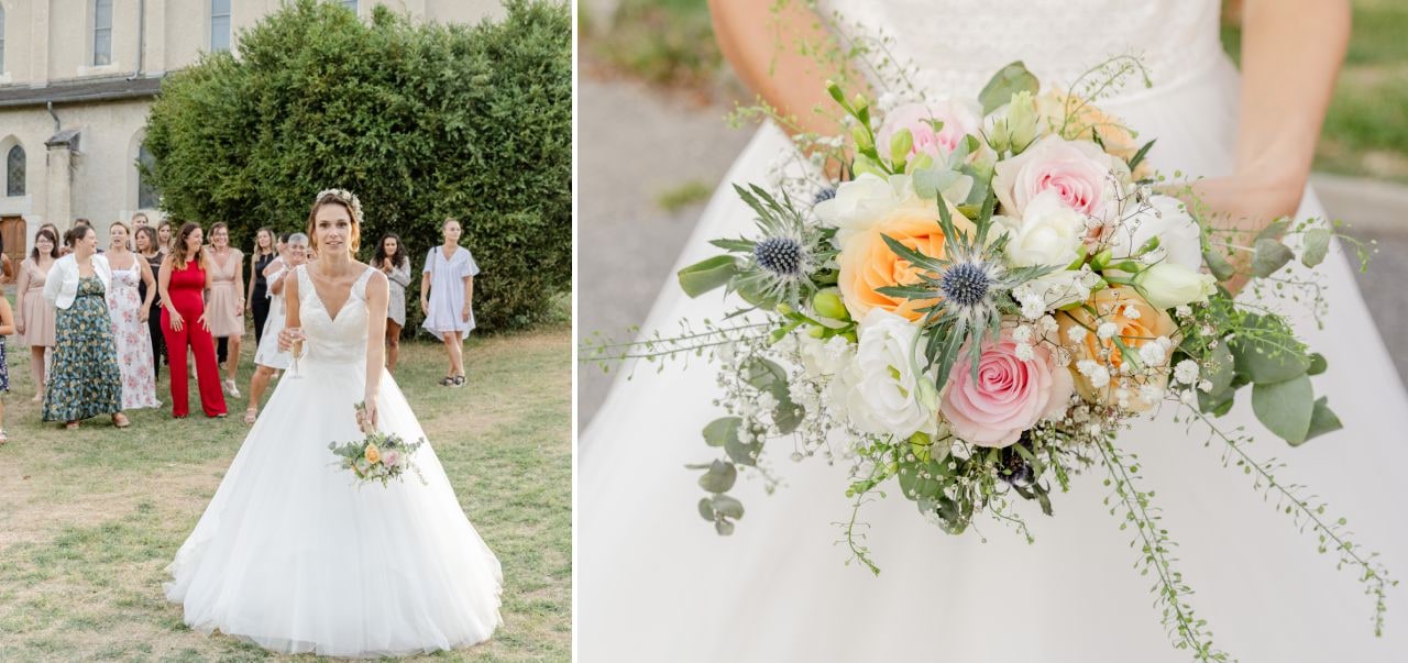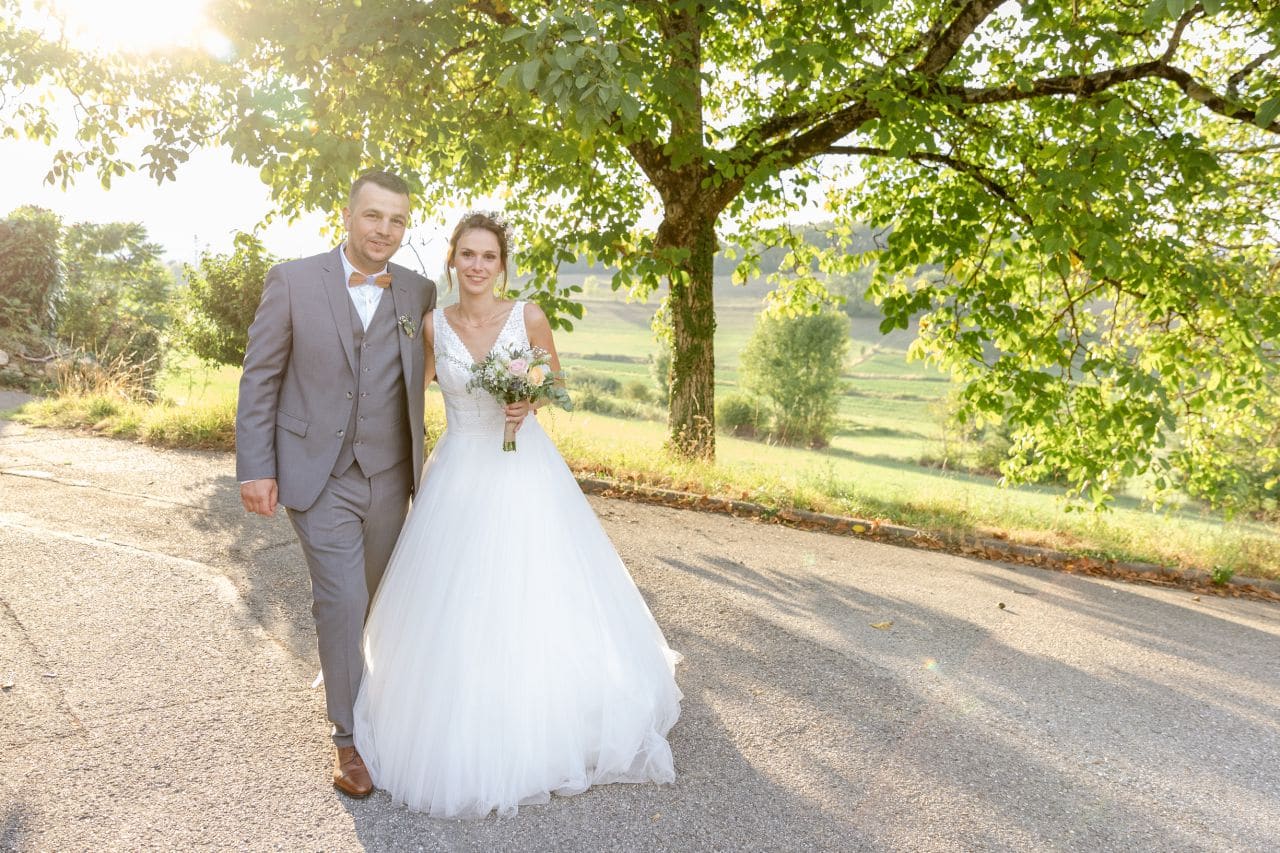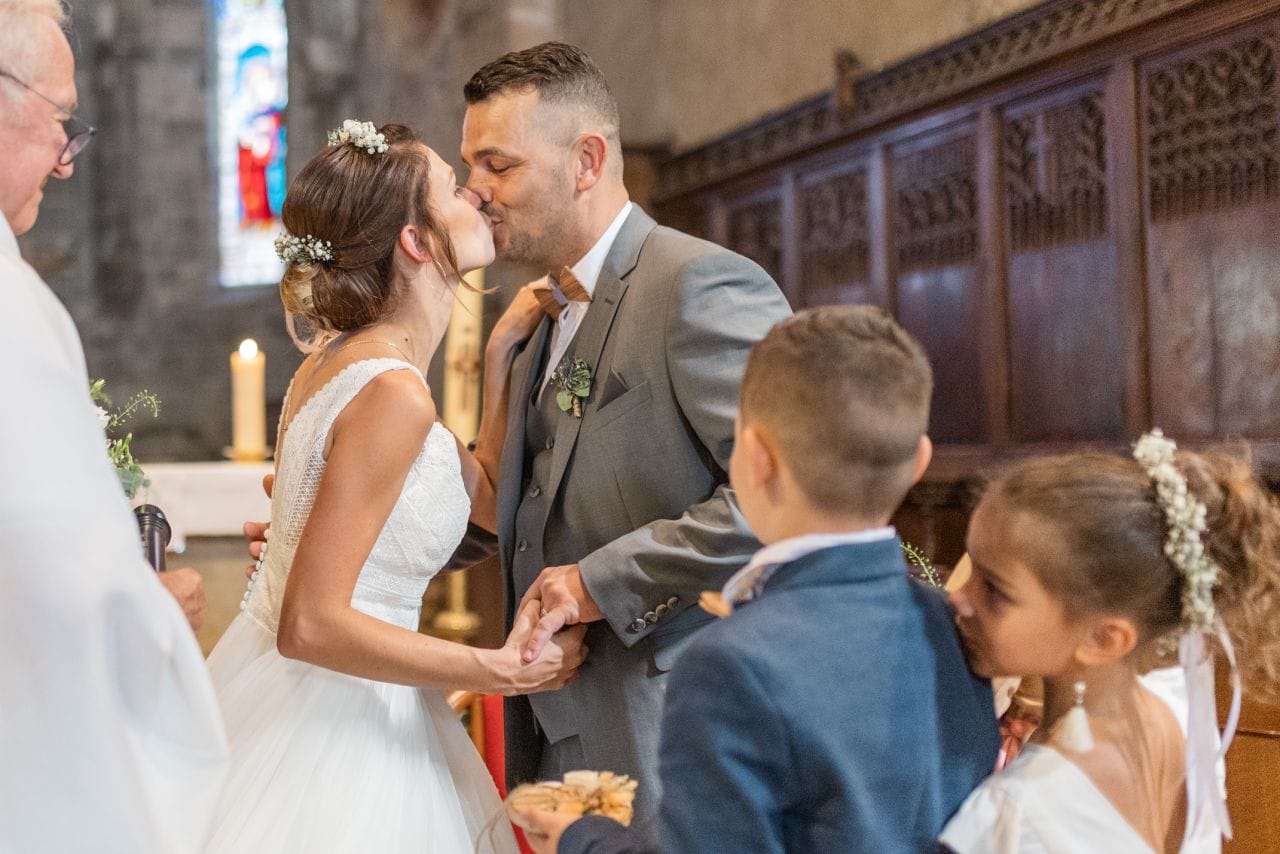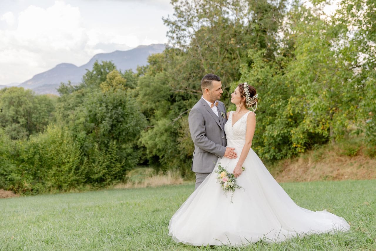 Nous avions rendez-vous sous un soleil radieux devant la mairie de Yenne. Pendant que le futur marié accueillait les invités, je tendais l’oreille à l’affût des coups de klaxon qui préviendraient de l’arrivée de la mariée. Ils souhaitaient se voir pour la première fois avant de faire leur entrée dans la mairie. Et les larmes d’émotion étaient bien là. Après l’union civile, tout le cortège s’est dirigé vers l’église juste à côté. Ce fût une très belle cérémonie religieuse, touchante et joyeuse. Ensuite, c’est accompagnés de leurs enfants qu’ils sont sortis de l’église sous une déferlante de bulles. Après les traditionnelles photos de groupe, le temps était venu de prendre les voitures pour réaliser un cortège qui ferait le tour du village de Yenne avant de monter à Saint-Paul.