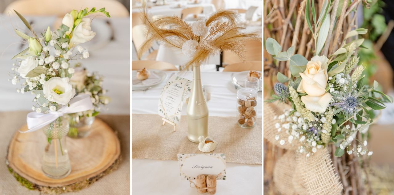 Je suis toujours impressionnée de voir les décorations de mariage en mode DIY. A vrai dire, je n’imagine même pas les heures passées à réaliser les centres de tables et toutes ces éléments de déco. Mais au final, c’est une excellente solution pour limiter les coûts tout en personnalisant son mariage. Ici le thème du mariage champêtre était parfaitement respecté notamment grâce au herbes de la pampa.