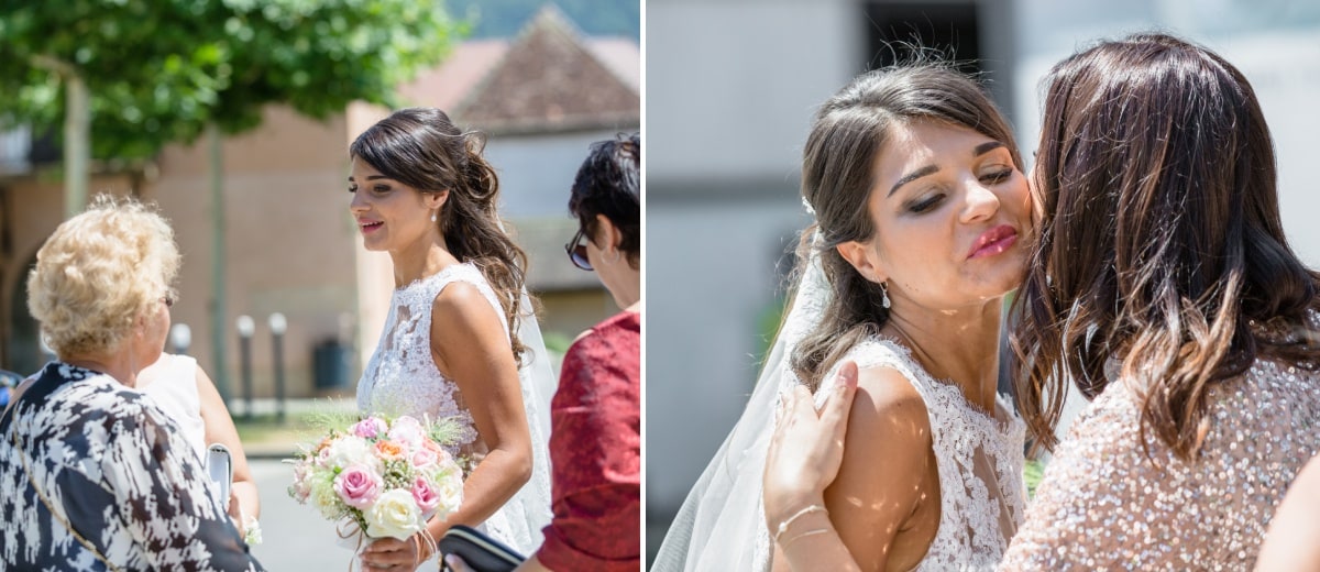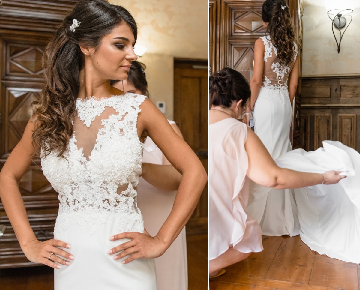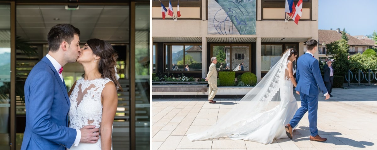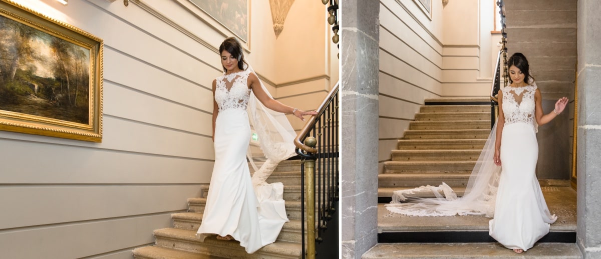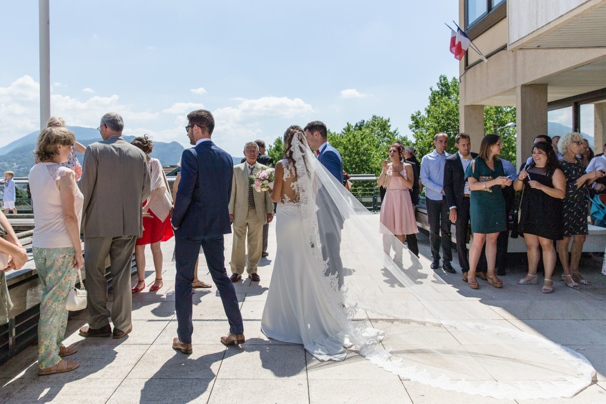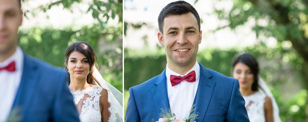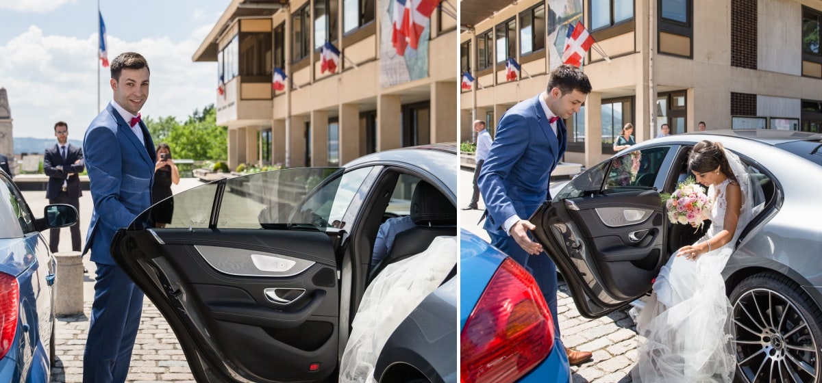Dans un premier temps, j’ai fait les photos de la robe et des autres détails. Puis, il était déjà l’heure de se préparer. Tout d’abord, c’est le marié qui s’est habillé dans la suite nuptiale. Ensuite, je suis allée chez les filles. La mariée était d’une beauté éclatante dans sa robe chic et élégante. C’était magnifique quand elle a descendu les escaliers. A la suite du « first look », nous avons réalisé les photos de couple dans le parc. Mais le temps filait. Par conséquent, il fallait vite partir sur Annecy pour la cérémonie civile.