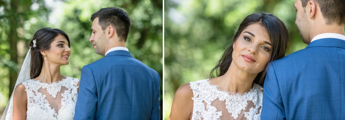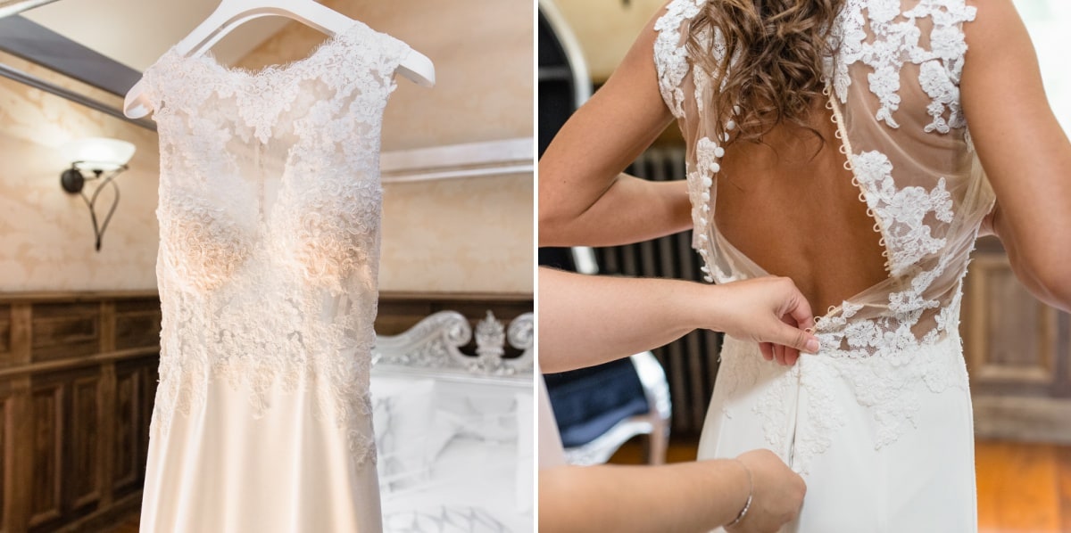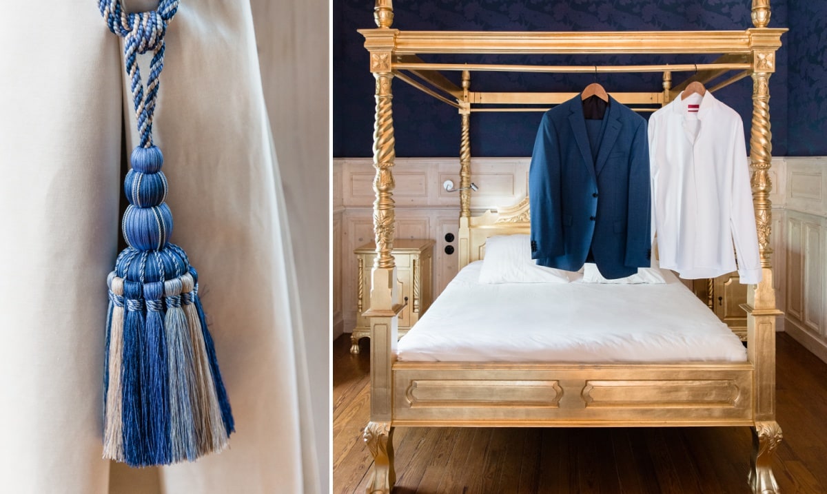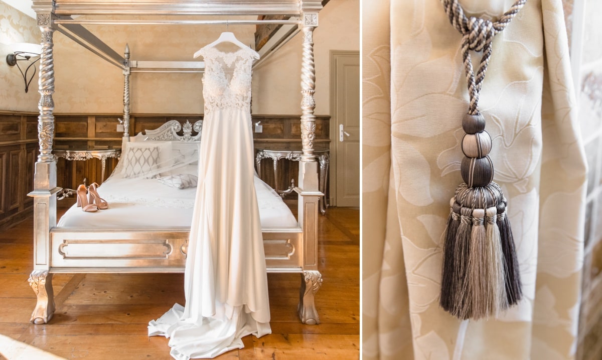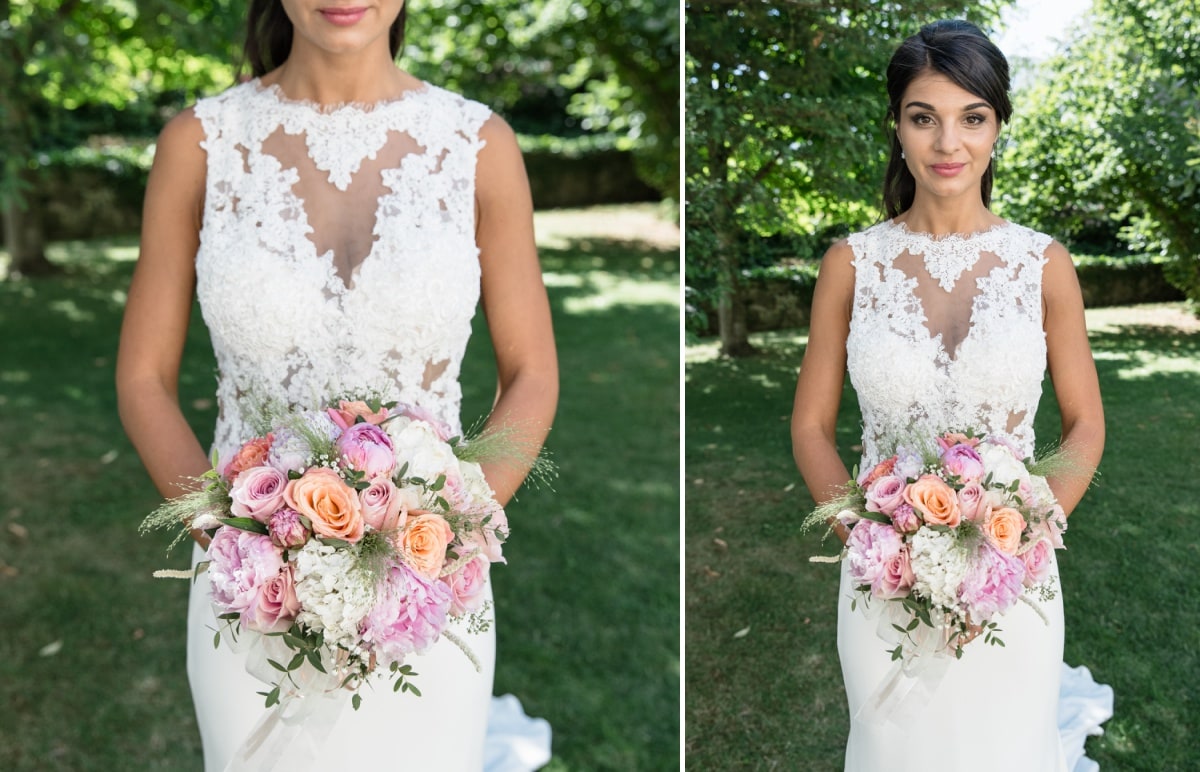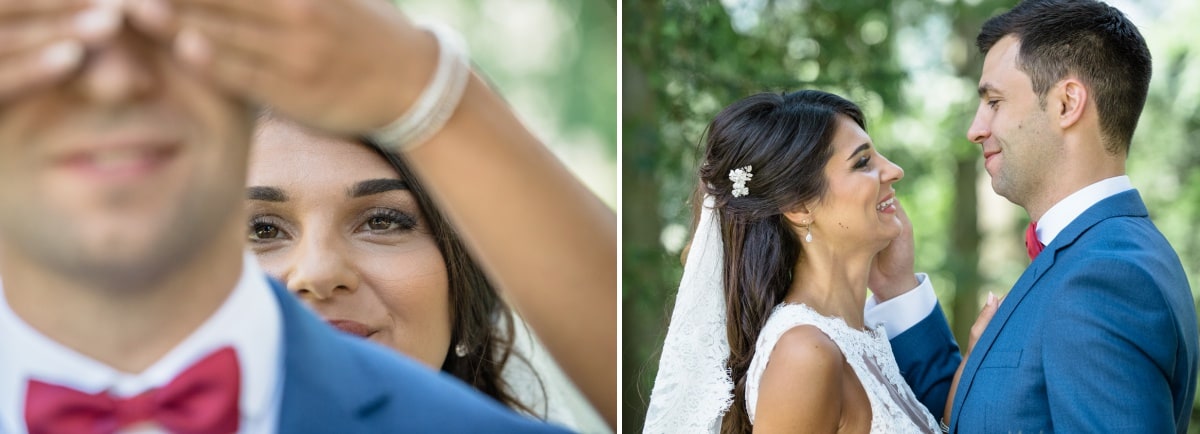 Dans un premier temps, j’ai fait les photos de la robe et des autres détails. Puis, il était déjà l’heure de se préparer. Tout d’abord, c’est le marié qui s’est habillé dans la suite nuptiale. Ensuite, je suis allée chez les filles. La mariée était d’une beauté éclatante dans sa robe chic et élégante. C’était magnifique quand elle a descendu les escaliers. A la suite du « first look », nous avons réalisé les photos de couple dans le parc. Mais le temps filait. Par conséquent, il fallait vite partir sur Annecy pour la cérémonie civile.