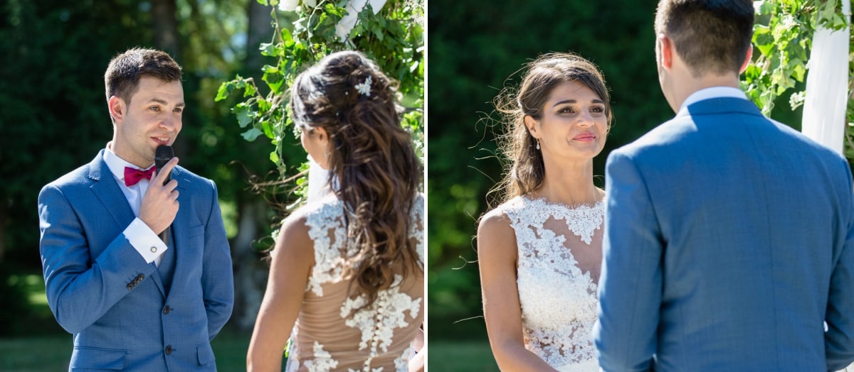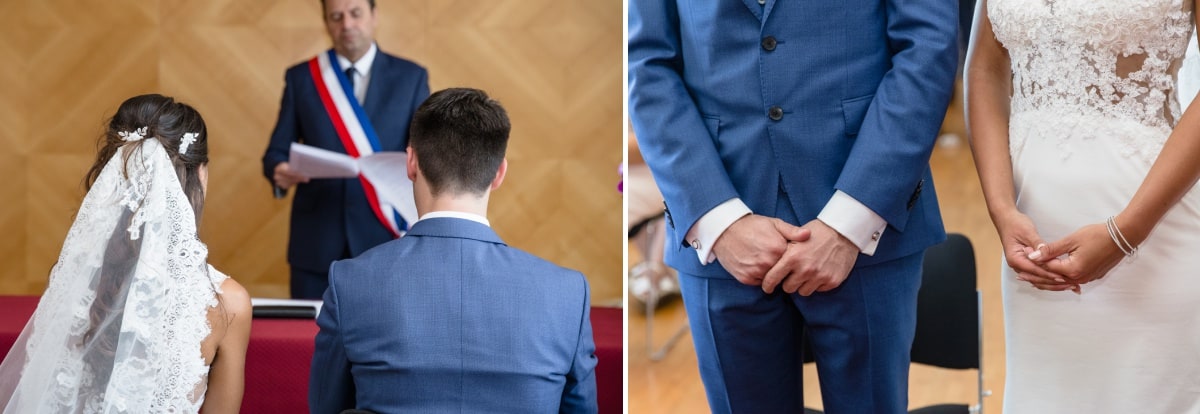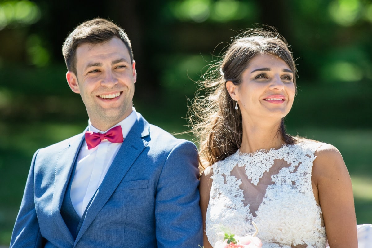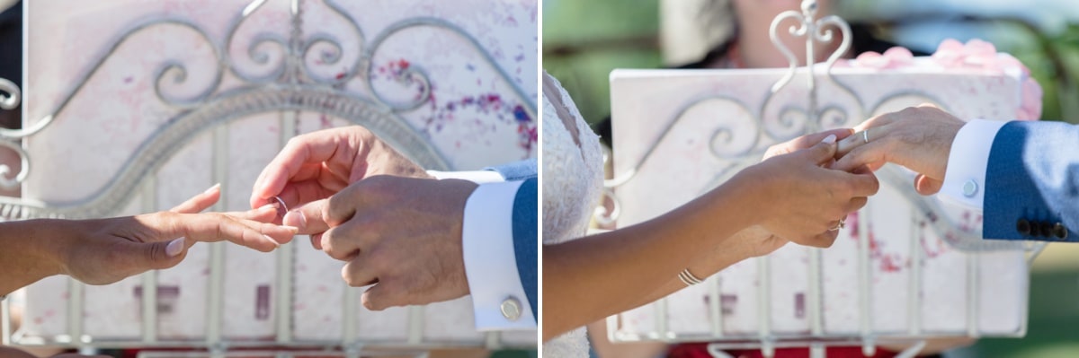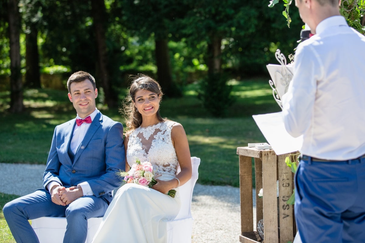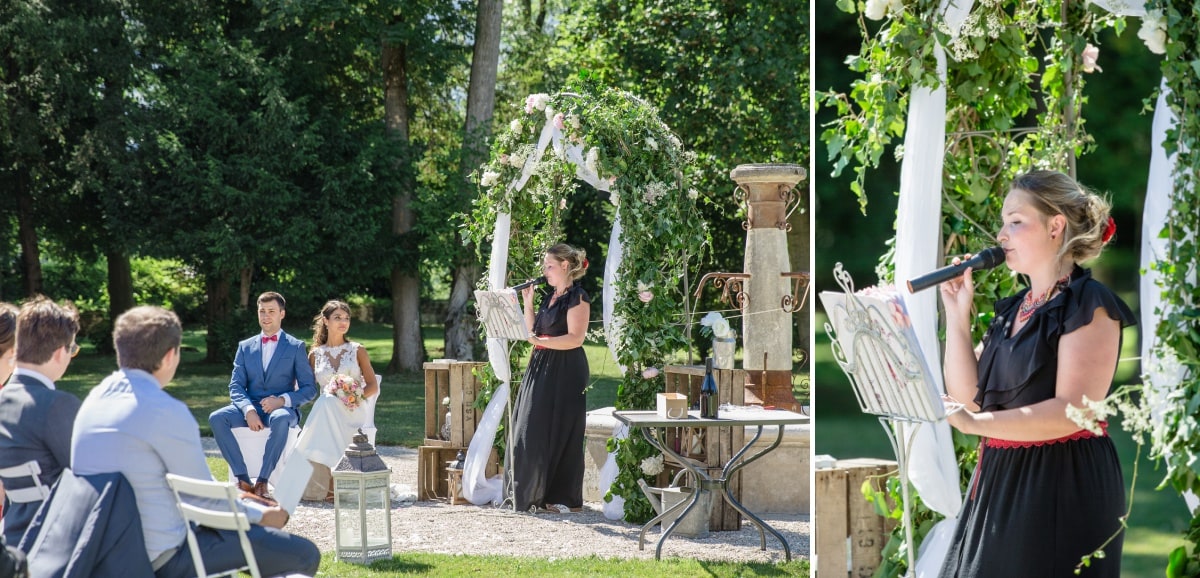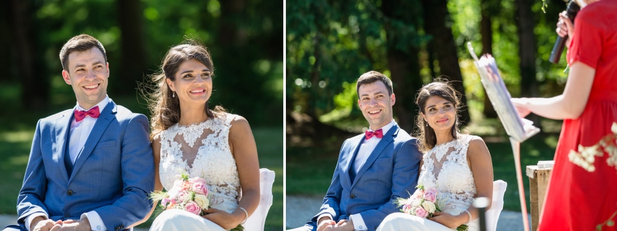 Dès le matin, la journée s’annonçait radieuse avec un beau soleil. Lorsque l’on organise une cérémonie laïque en extérieur, on a toujours un peu d’angoisse sur le risque météo. De ce fait, les jours précédents on croise les doigts pour que le ciel soit tout bleu. Et au final il n’y a aucun nuage. Au contraire, il fait même trop chaud ! Par contre et heureusement, la mariée avait prévu des éventails.