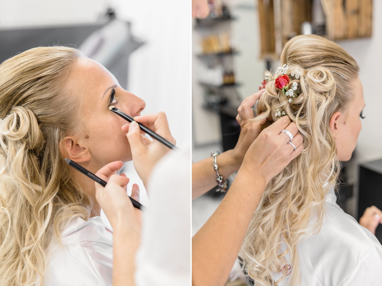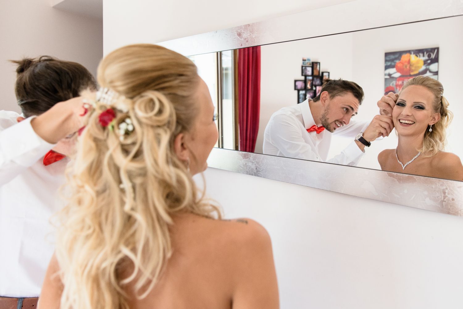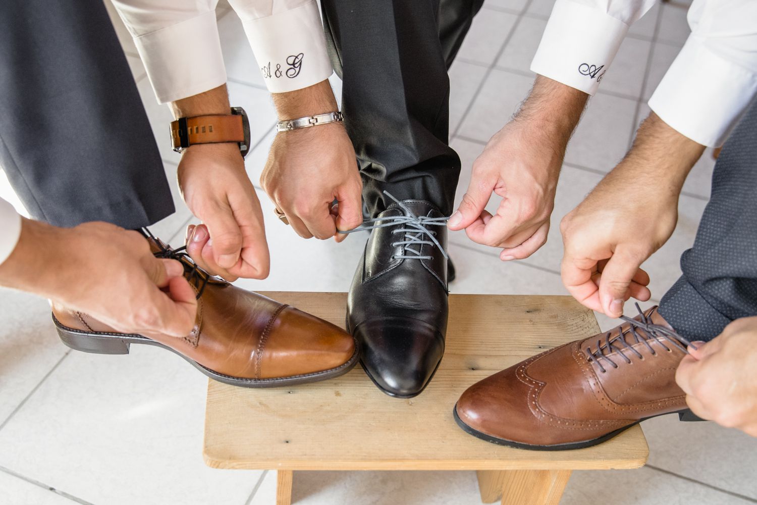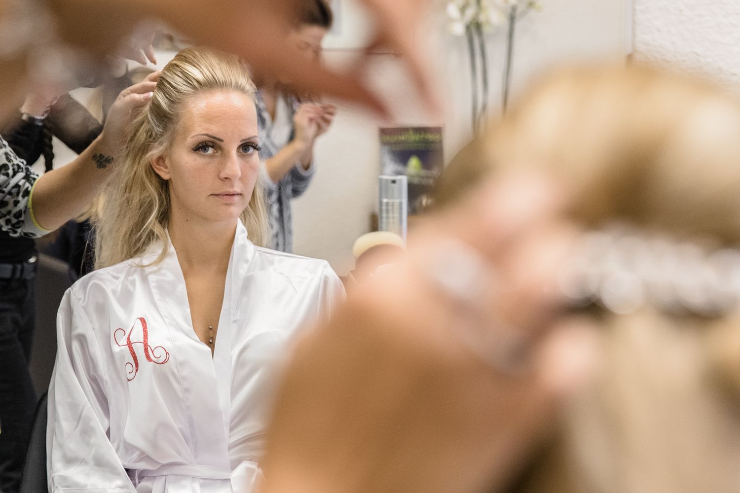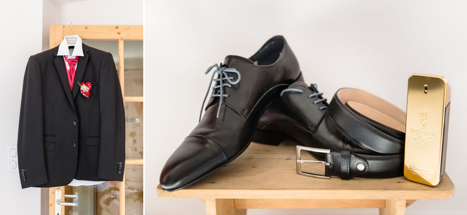 Pour commencer cette journée de mariage, nous avions rendez-vous dans le centre de Saint-Jean-de-Maurienne dans un salon de coiffure privatisé pour l’occasion. A vrai dire, la future mariée et sa témoin se faisaient maquiller et coiffer dans une ambiance détendue. Après quelques photos je suis passée récupérer les fleurs. En cas de besoin, je suis aussi là pour dépanner. Après cela, nous avons rejoint la maison familiale pour la suite des préparatifs. Au préalable, nous avions pris toutes les précautions pour que les futurs mariés ne puissent pas se croiser. A vrai dire, la maison était très grande et partagée par la famille. C’est ce style de grande maison que l’on trouve beaucoup dans nos régions. Du coup, il était entendu que l’habillage se ferait au premier étage et chacun son tour. En premier lieu, le marié et ses témoins puis ce serait aux filles de s’habiller.
